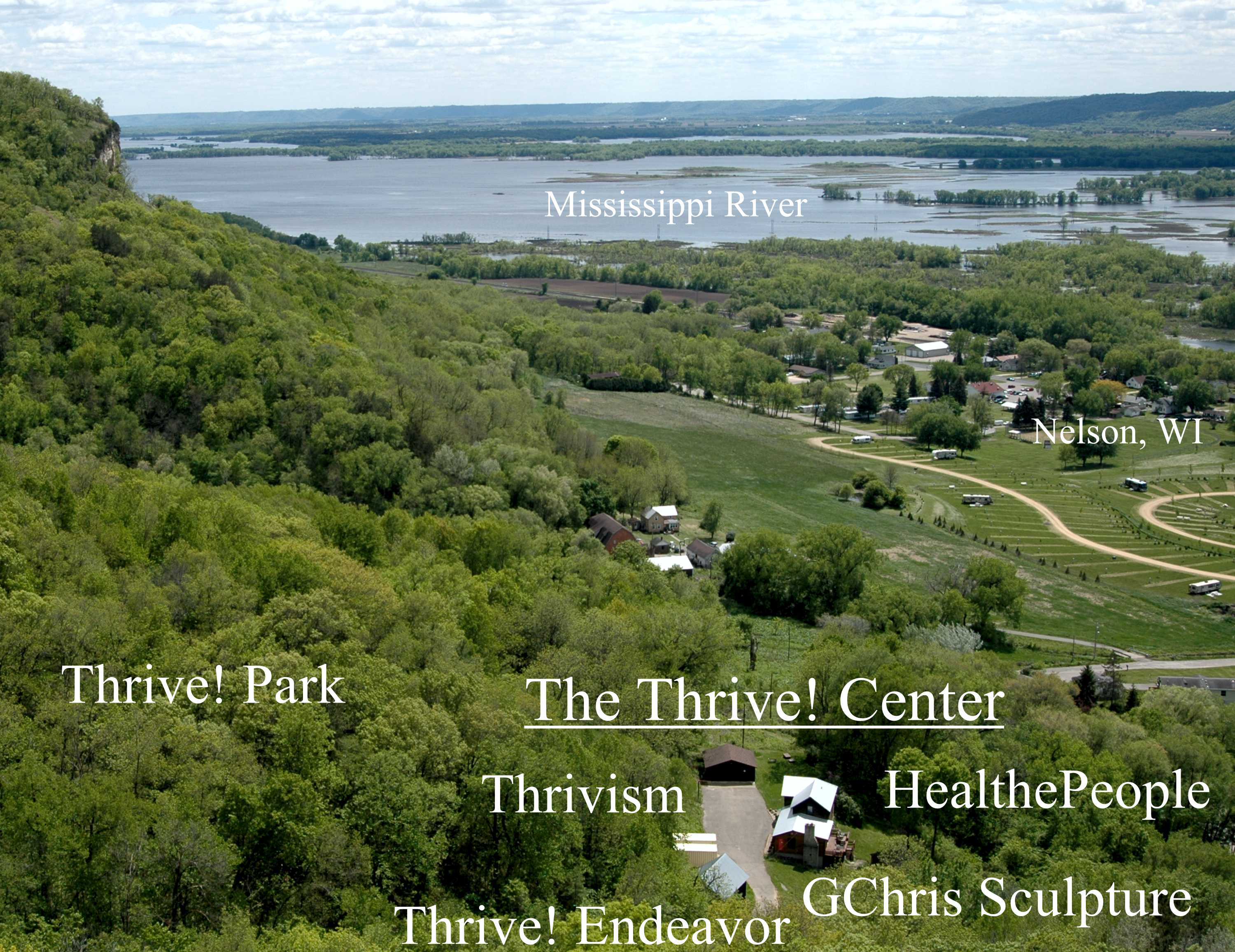 The Thrive! Center, home of Thrivism, Thrive! Endeavor, HealthePeople and GChris Sculpture, is on Mississippi River bluffside in restored 1885 farmhouse and barn above Village of Nelson (WI). It is surrounded by Thrive! Park, a 25+ acre, bluff side, public park donated by Chris.