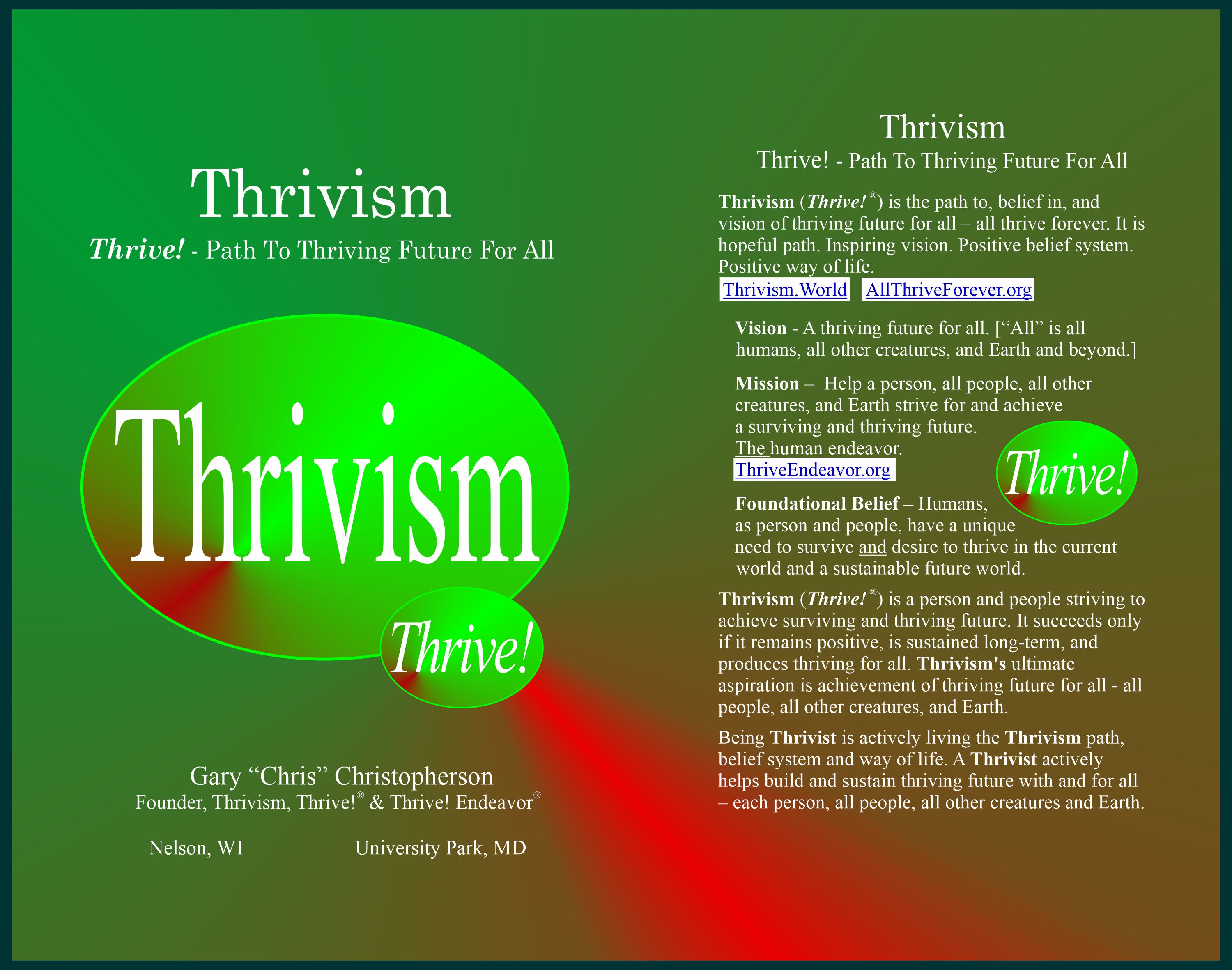 Thrivism® (Thrive!®) is the path to, belief in, and vision of thriving future for all – all thrive forever.is hopeful path. Inspiring vision. Positive belief system. Positive way of life.It is hopeful path. Inspiring vision. Positive belief system. Positive way of life. More information at Thrivism.world