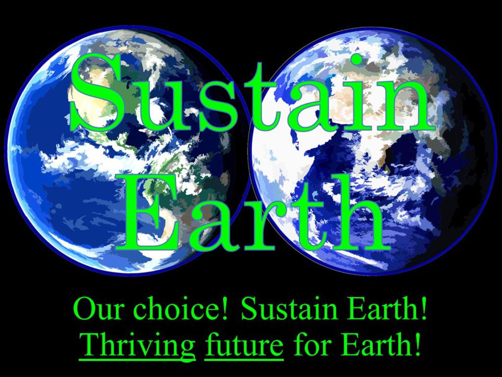 sustain Earth – Our choice. Sustain Earth. Or not sustain Earth. And no, escaping to another “Earth” is not viable. Today, some work to sustain Earth. But most do little to sustain Earth. Today, many work to damage Earth. And most do little to avoid damaging Earth. Our choice. Damage Earth. Early extinction for humans and damaged Earth. Our choice. Sustain Earth. Thriving future for humans and Earth. www.ThriveEndeavor.orgwww.EndangeredFuture.org